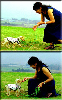 犬につけたリードの端を持ち、犬を『コイコイ』と甲高い声で呼びながら走ります。 犬が追いついてきたら、すぐさましゃがんで犬の首輪近くのリードを持ち、餌を与えます.