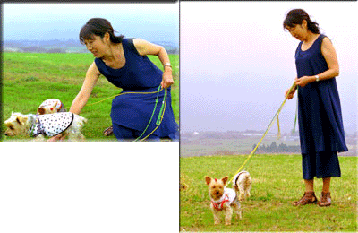 犬がノロノロしていたら少し犬に近づき、きびすを返して逃げるふりをします。 公園などで犬が来ないと「バイバイ」と言う人がよくいますが、その心境で演技します.
